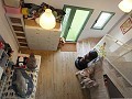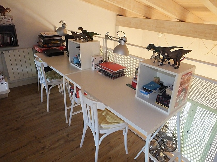 Vom zweiten Schlafzimmer führt eine Treppe zu einem Zwischengeschoss mit einem dritten Schlafzimmer und einem Arbeitsbereich.