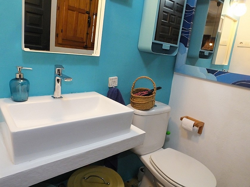 Die Treppe führt uns vom Wohnzimmer in die erste Etage, wo sich ein großzügiges Duschbad mit Waschbecken, Bidet und WC sowie ein hübscher blauer Fliesenboden befinden.