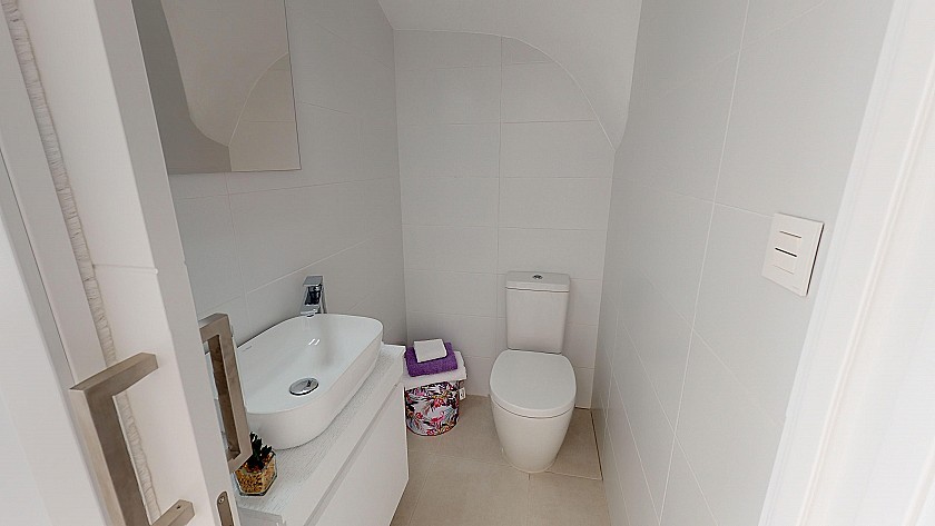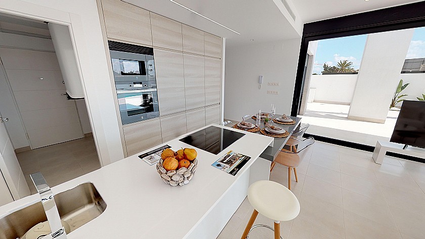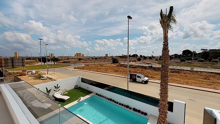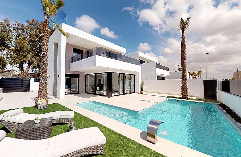 Perfekt gestaltet … diese wunderschöne zweistöckige Villa wurde sorgfältig entworfen, um den perfekten individuellen, privaten, modernen Wohnraum zu bieten. Sie verfügt über doppelte Vollglas-Schiebetüren, die direkt auf eine große Terrasse mit privatem, umzäuntem Pool und Garten mit Parkplatz abseits der Straße führen. „SUN ALL DAY“ mit Terrassenbereich im ersten Stock, um den ganzen Tag die Sonne zu genießen … Das Hotel liegt in einer zentralisierten, etablierten Wohngegend, nur 10 Gehminuten von den Stränden in San Pedro del Pinatar entfernt.