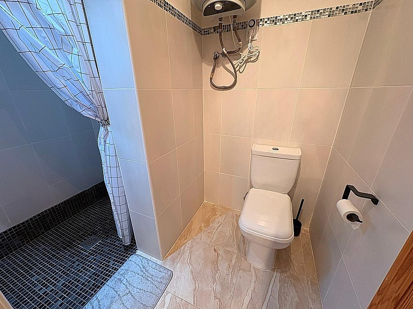The outdoor area also includes a dedicated pool house, a separate guest annex with toilet and sink, a convenient outdoor shower, and generous terraces and shaded areas for relaxing.