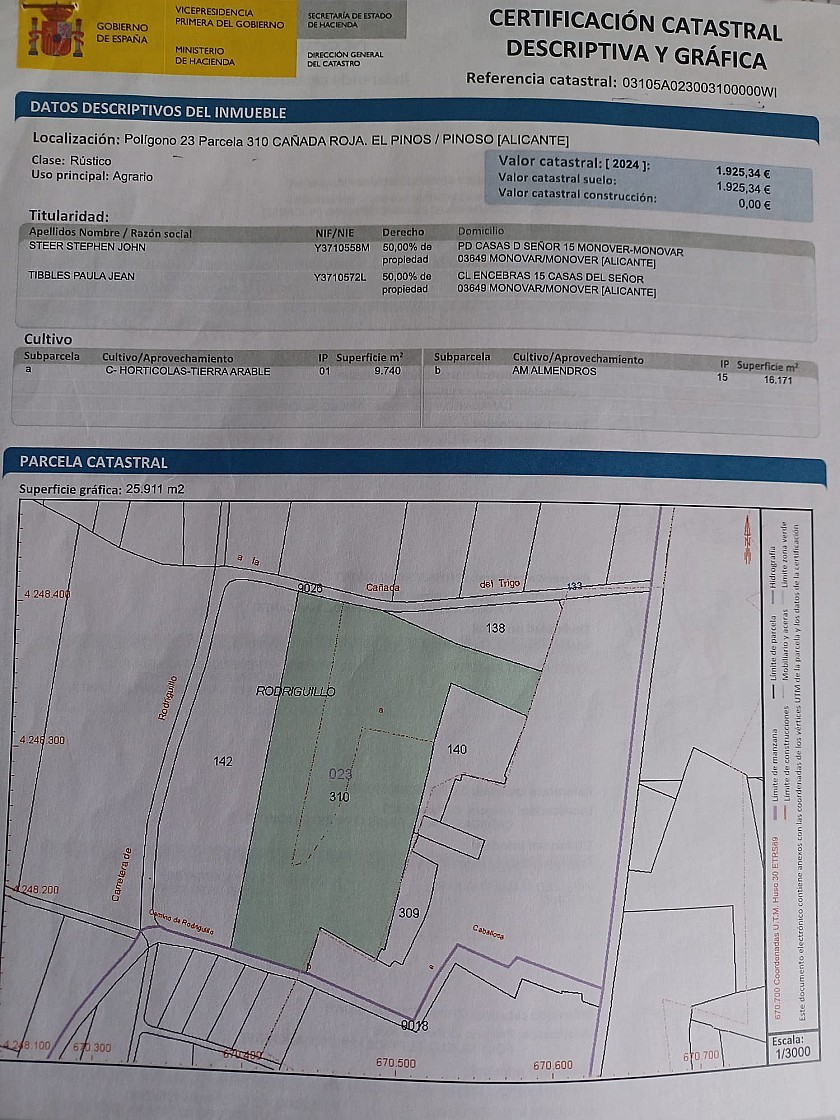The plot of land is 26500m2 and very private being planted with 300 almond trees, and has lovely views. It has tarmac access and is connected to mains electricity and riego water, drinking water is available in the road and can be connected (the town hall has already done a survey for this)