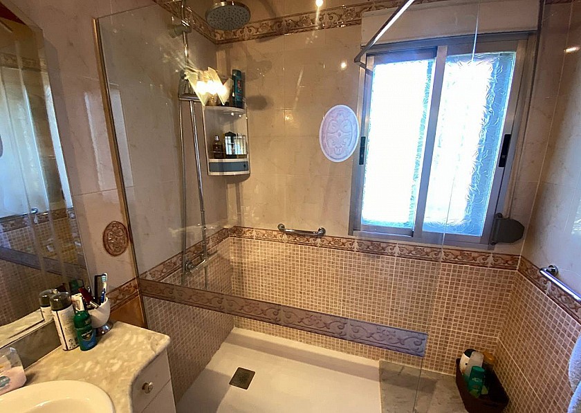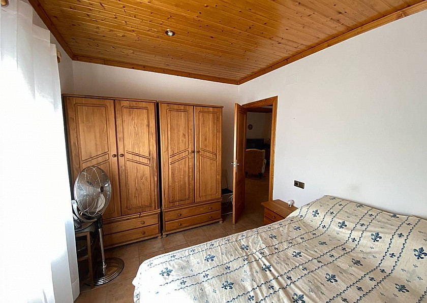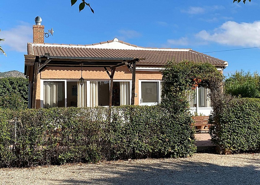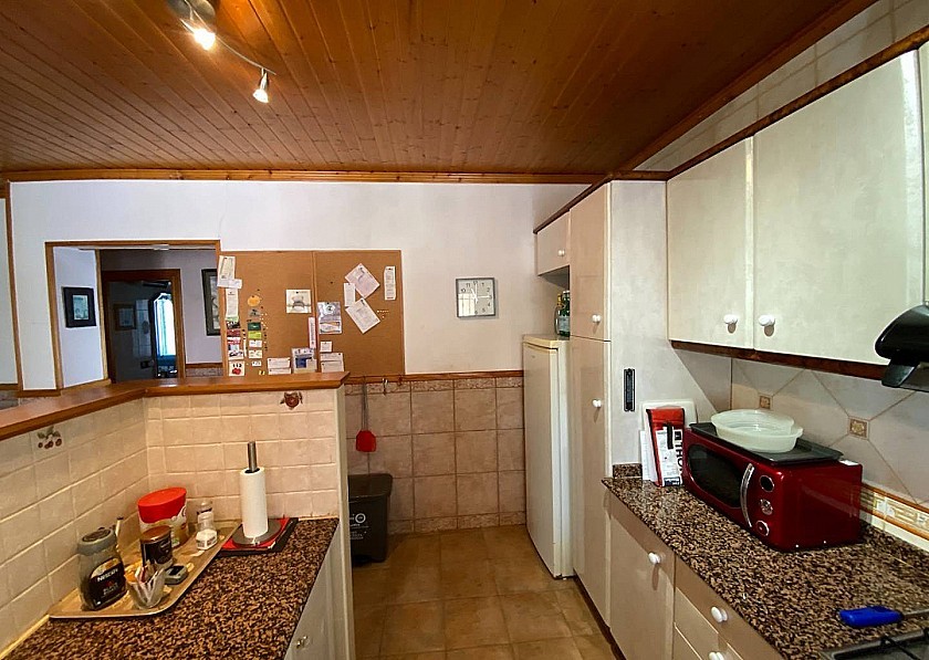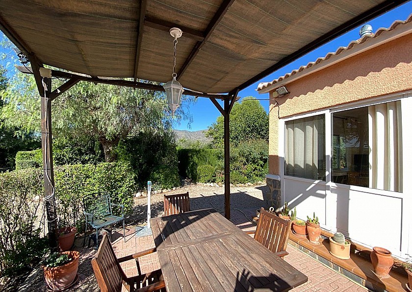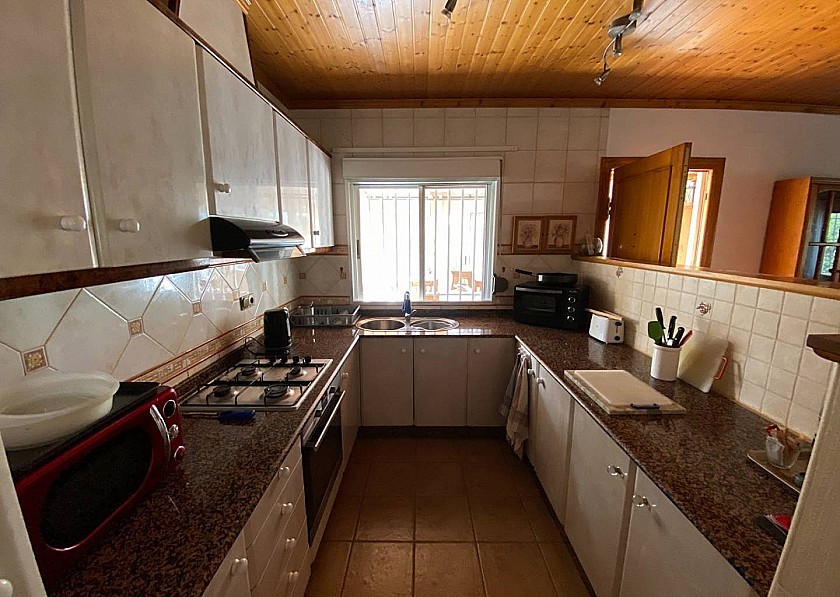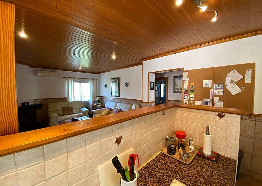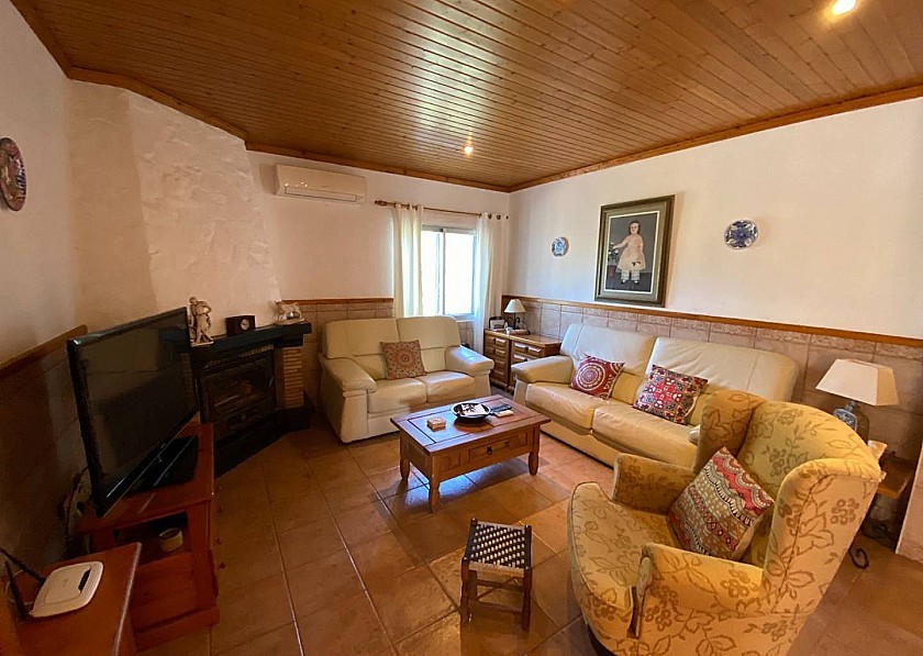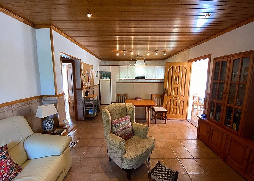At the front of the property, we have a quite lovely terrace with a pergola and extraordinary views of the mountains. From here you enter the conservatory and this is where you would live pretty much, it´s gorgeous and is built to adapt to the weather with windows all around that can be opened up to allow the mountain breeze to come through or closed in winter to trap the sunshine, it is more like a lounge/diner than a conservatory but, moving onwards we enter the open-plan lounge/diner/kitchen which has a fully fitted kitchen at one end and a cosy feature log fire at the other with plenty of space to relax in.