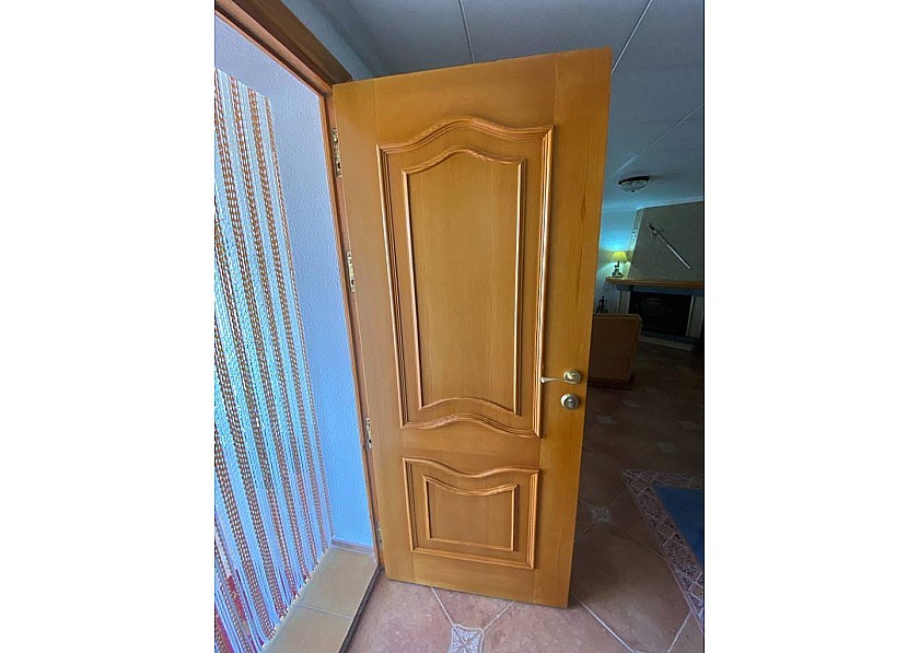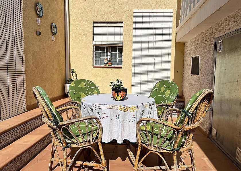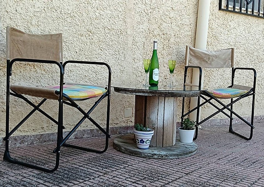 Opposite the entrance is another smaller metal door which, when open, you can see the storage space for the pump and filter for the swimming pool and even more space for strong stuff. A little patio area with a table and chairs offers outside dining.