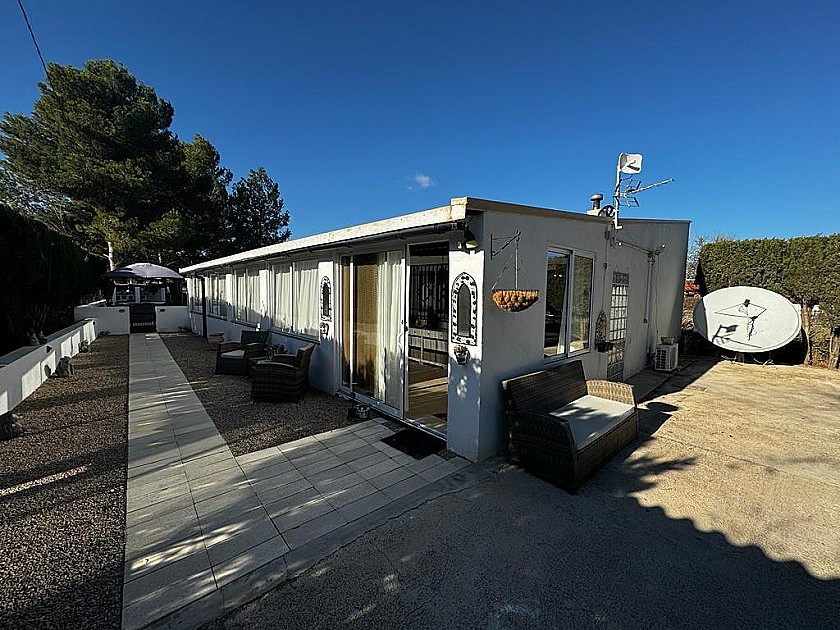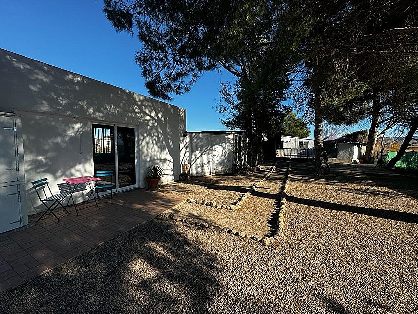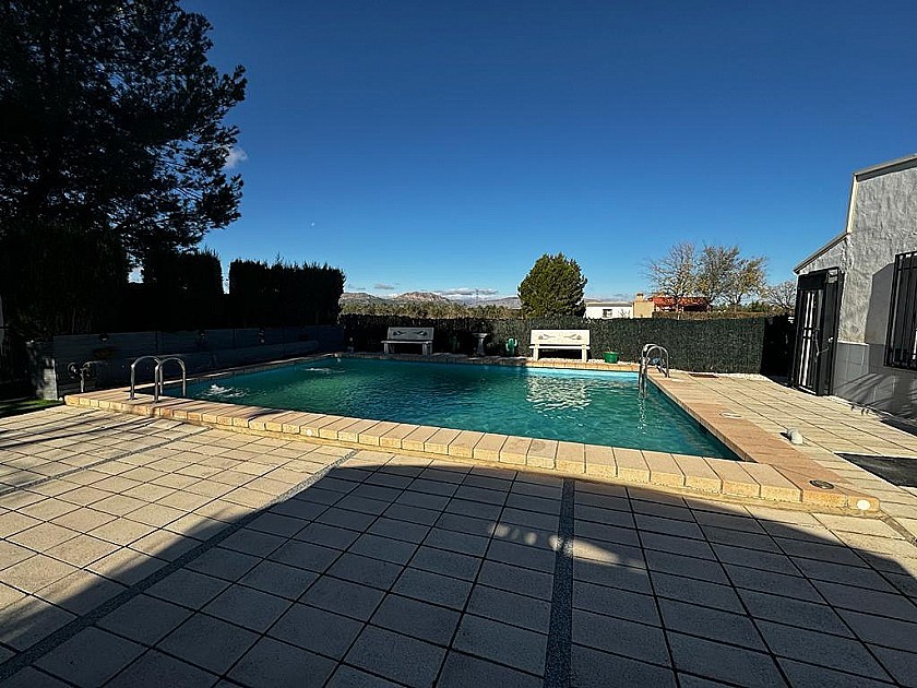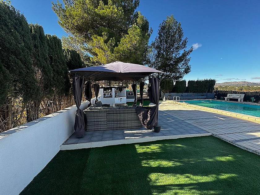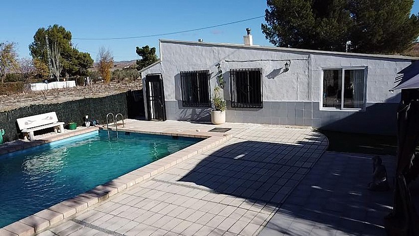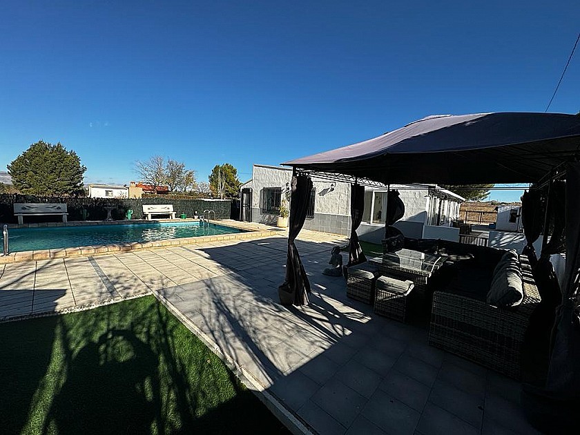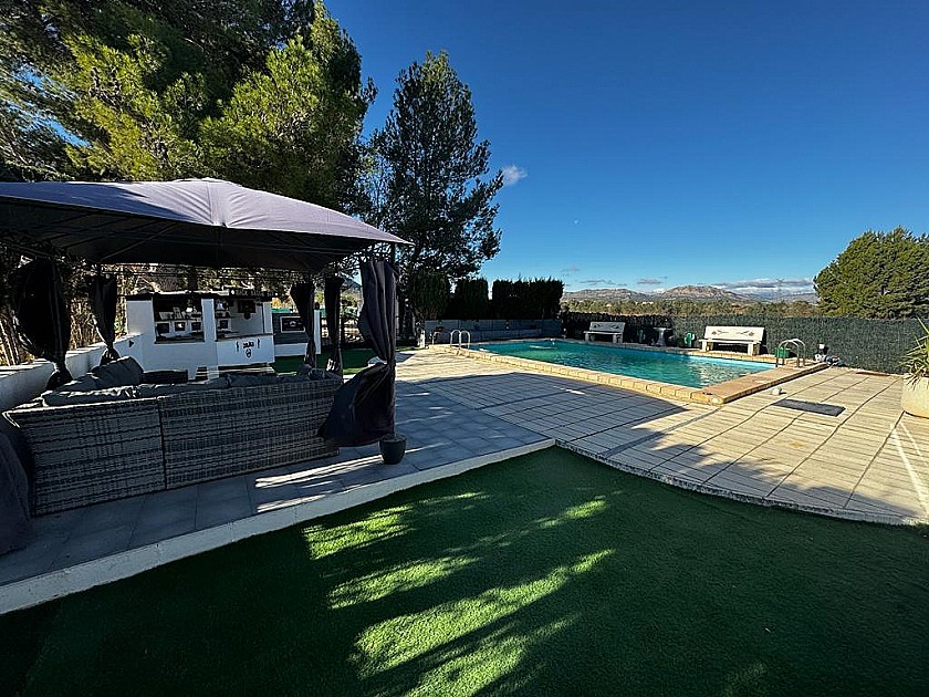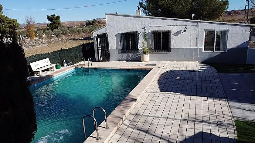 Fantastic Villa with a guest house and large swimming pool, nice bar and BBQ, the main villa has a large long glazed terrace perfect for various uses, then you enter the villa in to a living dining room with log burner and aircon, the hall way leads to a refurbished family bathroom, new kitchen and 3 double bedrooms one with ensuite which also has access to the pool area, outside you will find a well maintained garden with various storage sheds and the big guest house with its own kitchen and bathroom, the pool area is a perfect place to entertain with a new fully stocked bar and large patio area, the pool has a bubble cover. mains electric and water with good internet. the house has central heating but does require a new boiler