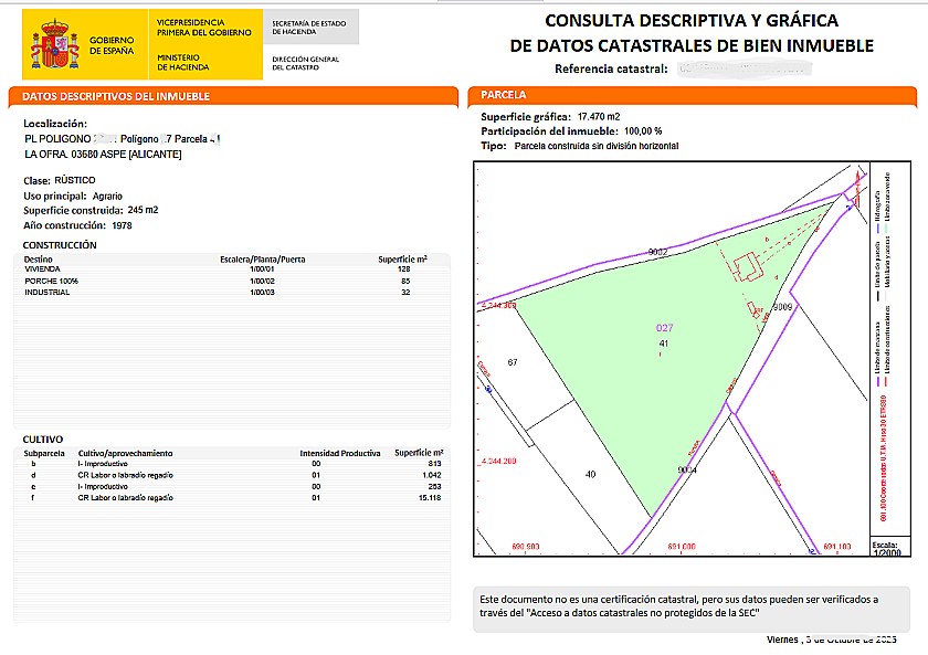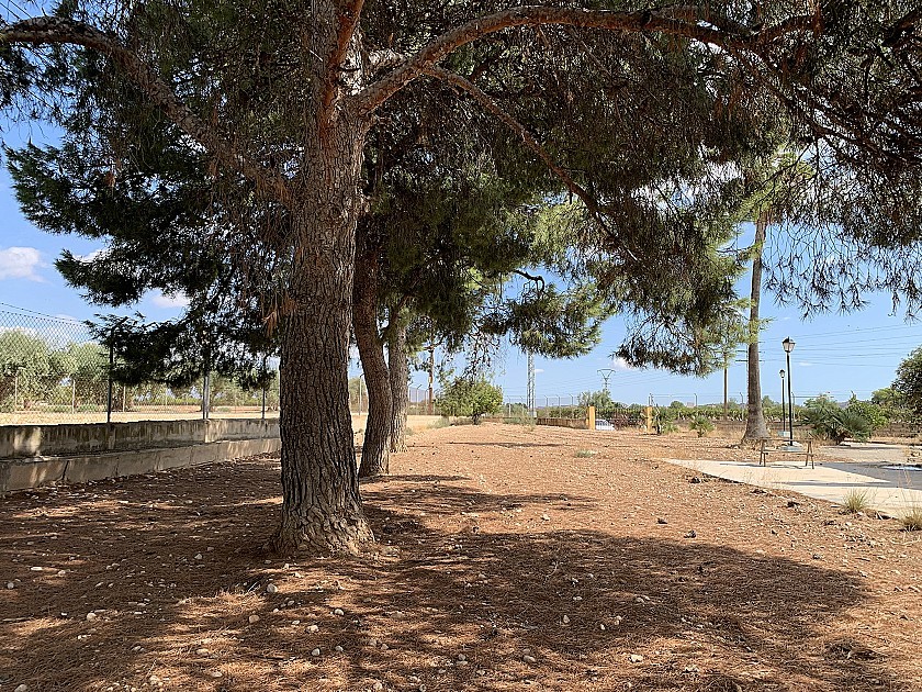 Esta fabulosa propiedad consta de dos parcelas principales: una de 14.500 m², antiguamente dedicada a la producción de uva, y ahora completamente llana, ideal para establos con picadero, zona de acampada o incluso un aparcamiento para autocaravanas o caravanas. La parcela total es de 17.500 m².