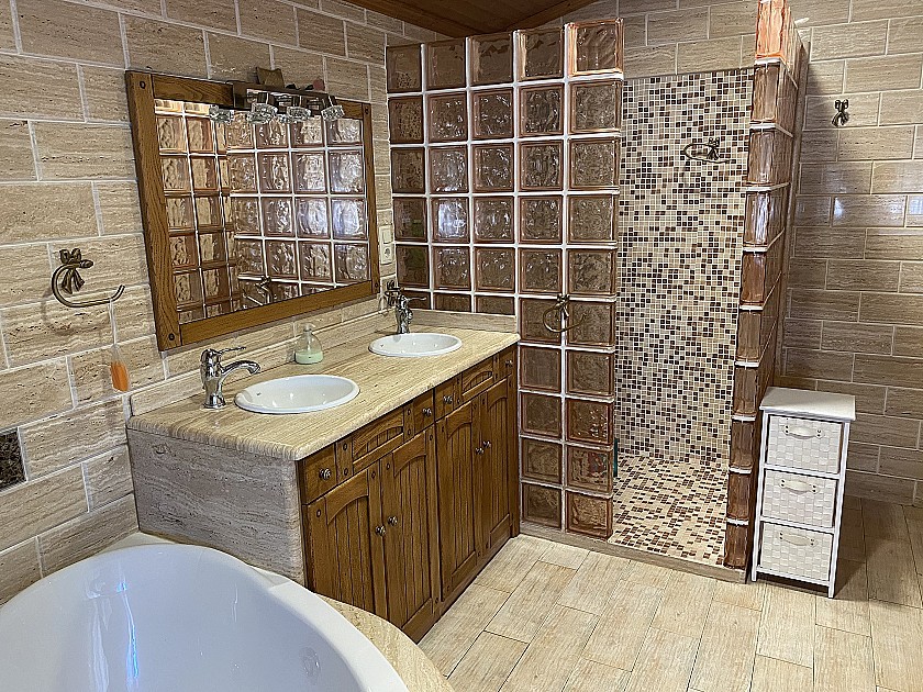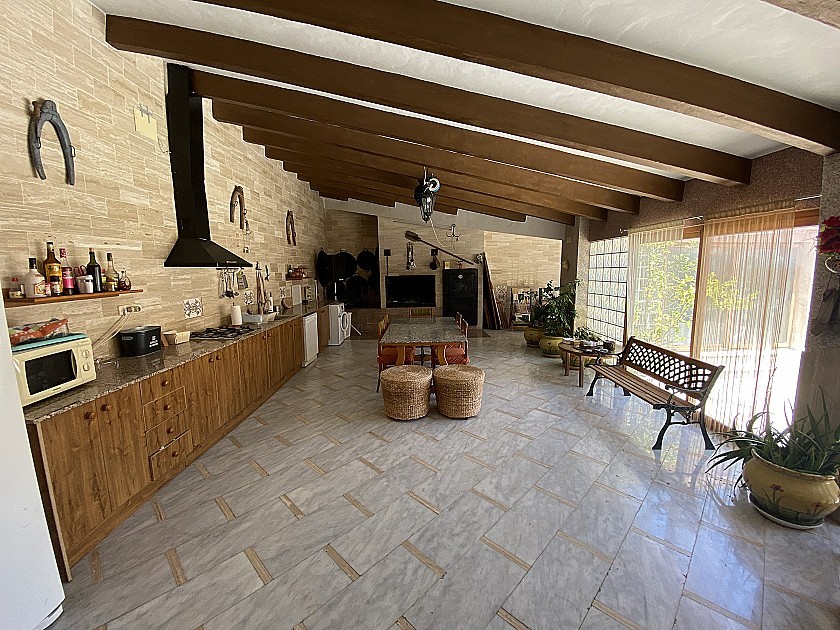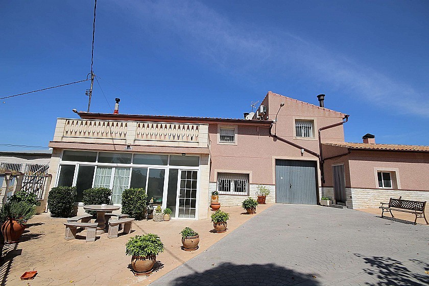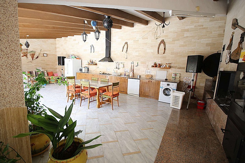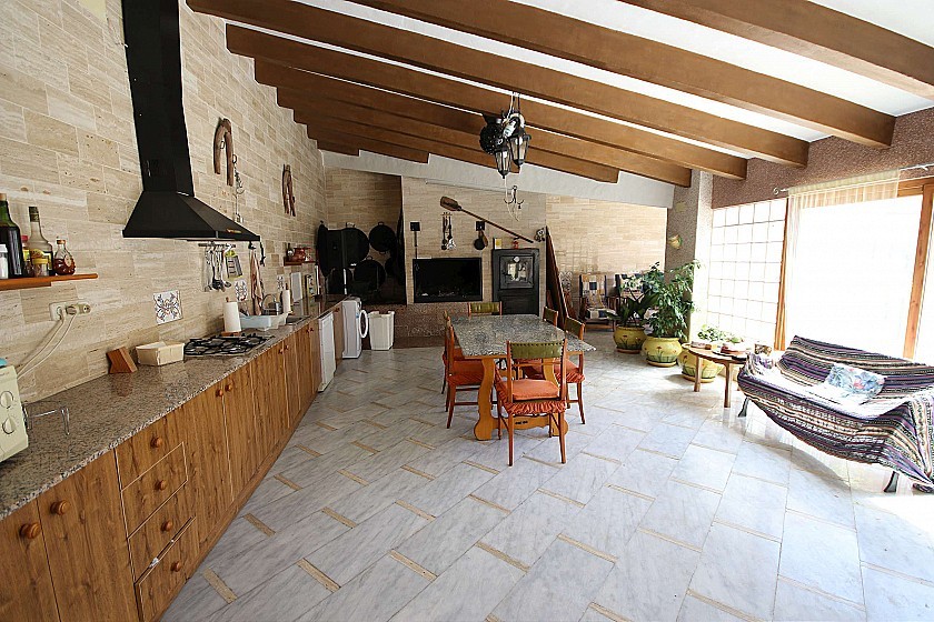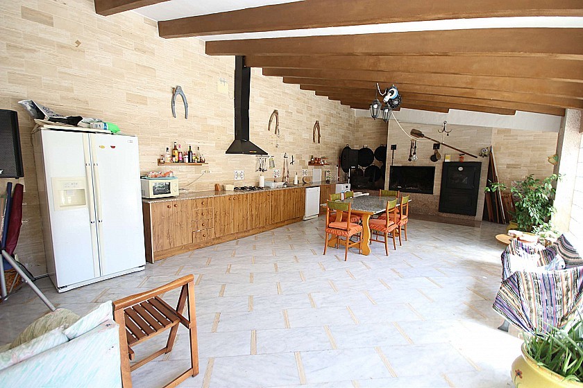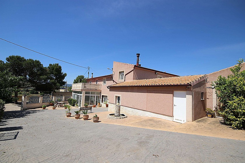 La casa tiene 6 dormitorios, 3 baños, aseo exterior, terraza de 20m², 2 cocheras (capacidad total para 4 coches), 2 cocinas completas, patio interior de 40m², salón-comedor con cocina, BBQ y horno de leña.