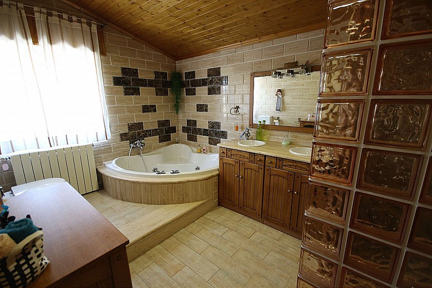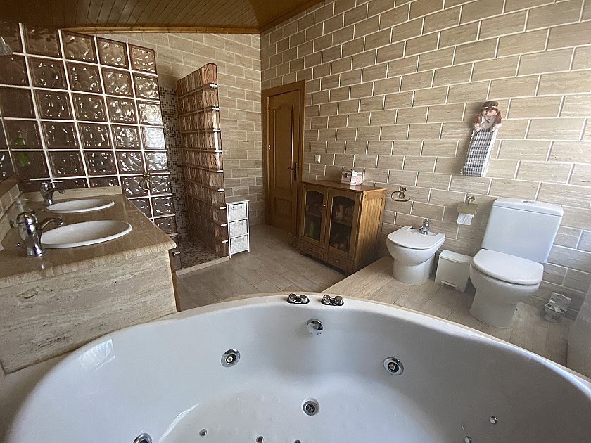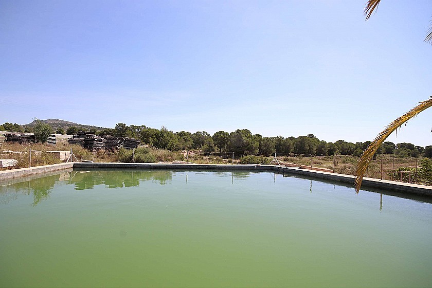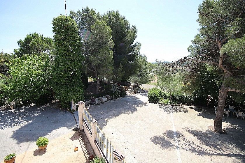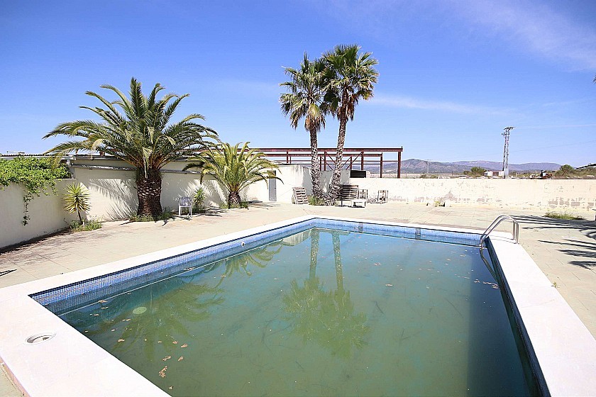 En el exterior hay una piscina de 70m³ y un depósito de agua de depósito de 600m³ para riego, una cochera para 10 coches y una pista de tenis con postes.