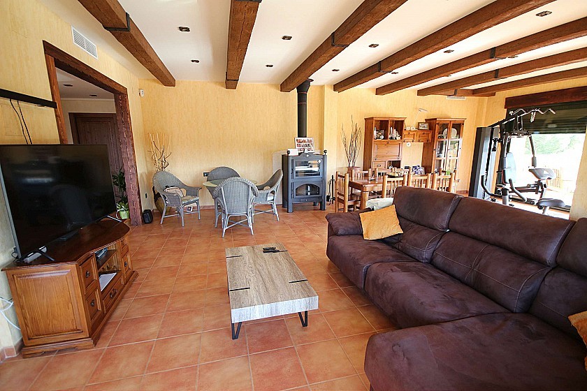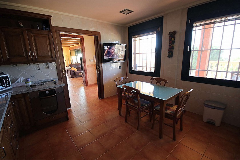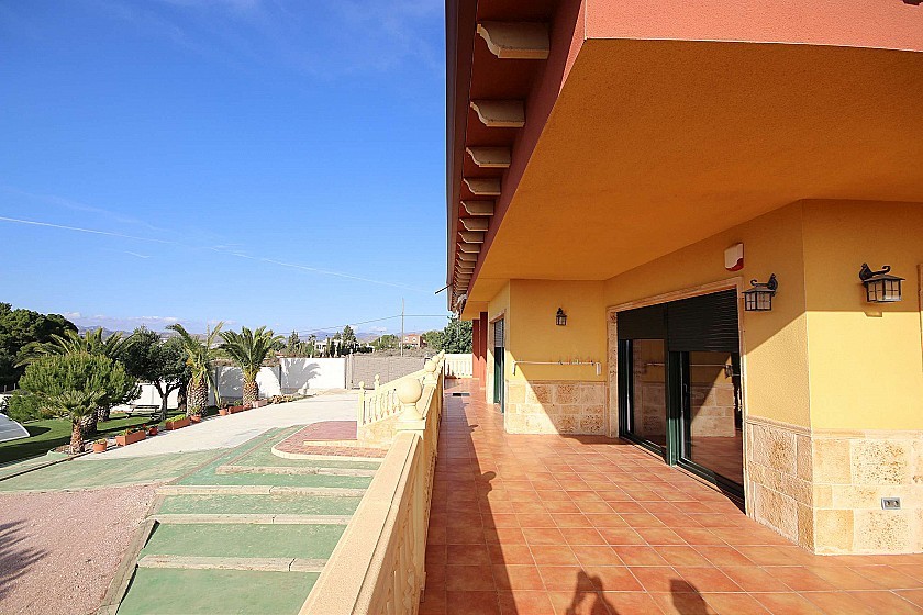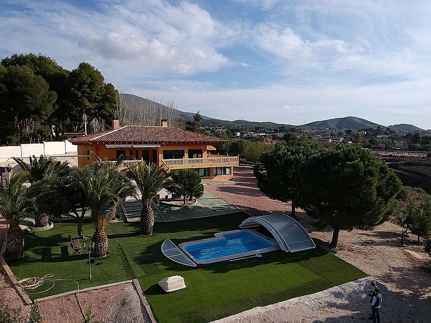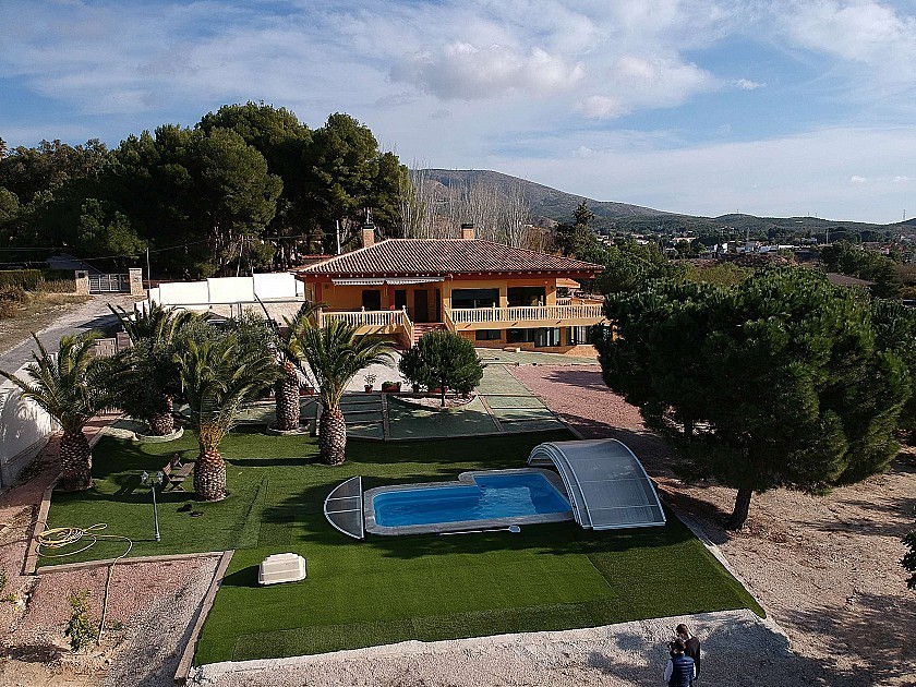 Gran chalet independiente con piscina cerca del pueblo en Elda / Petrer. Tiene 4 dormitorios, 2 baños, salón-comedor, cocina y lavadero en la planta principal, y un gran sótano con baño y cocina pequeña, y potencial para más dormitorios, como apartamento independiente. Afuera hay una bonita piscina con una cubierta deslizante y con césped artificial circundante y excelentes vistas. Construido en 2003. El tamaño de la casa es de 550m² y el tamaño de la parcela 4200m², totalmente vallada.