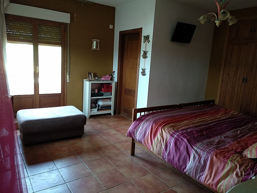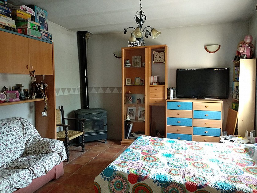 Pasillo que conduce al gran salón con chimenea + aire acondicionado, puerta que conduce al comedor / cuarto dormitorio con estufa, puerta del salón a 2 salas cueva.