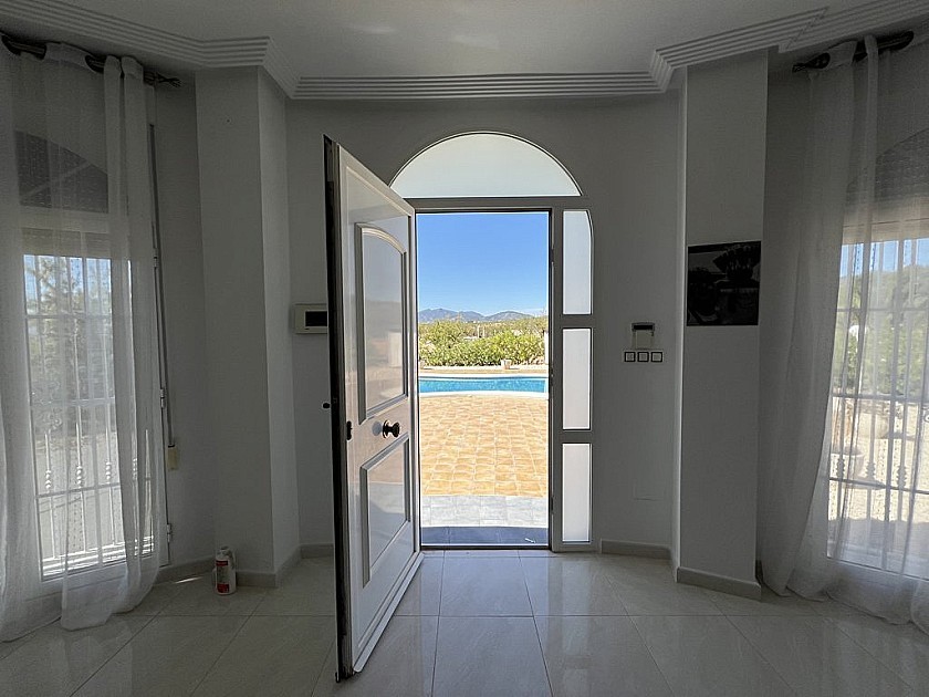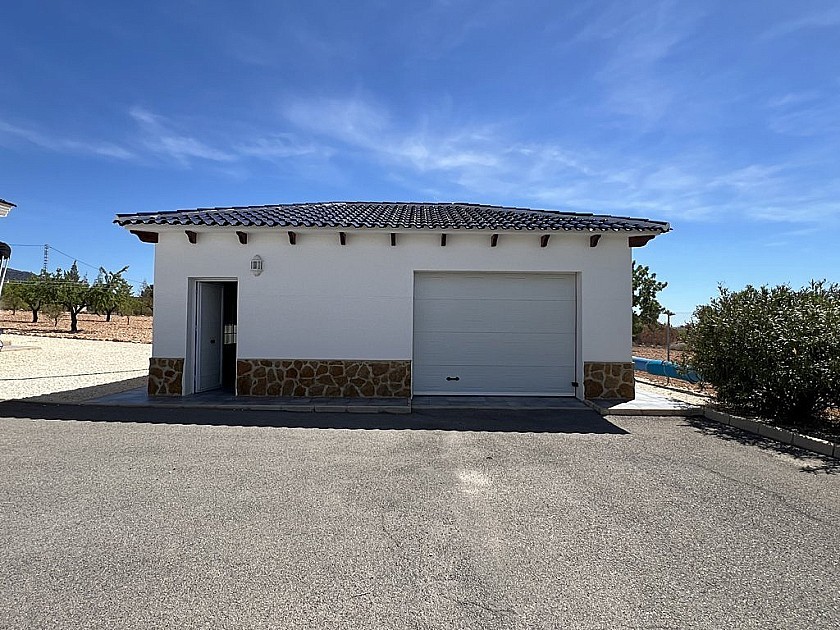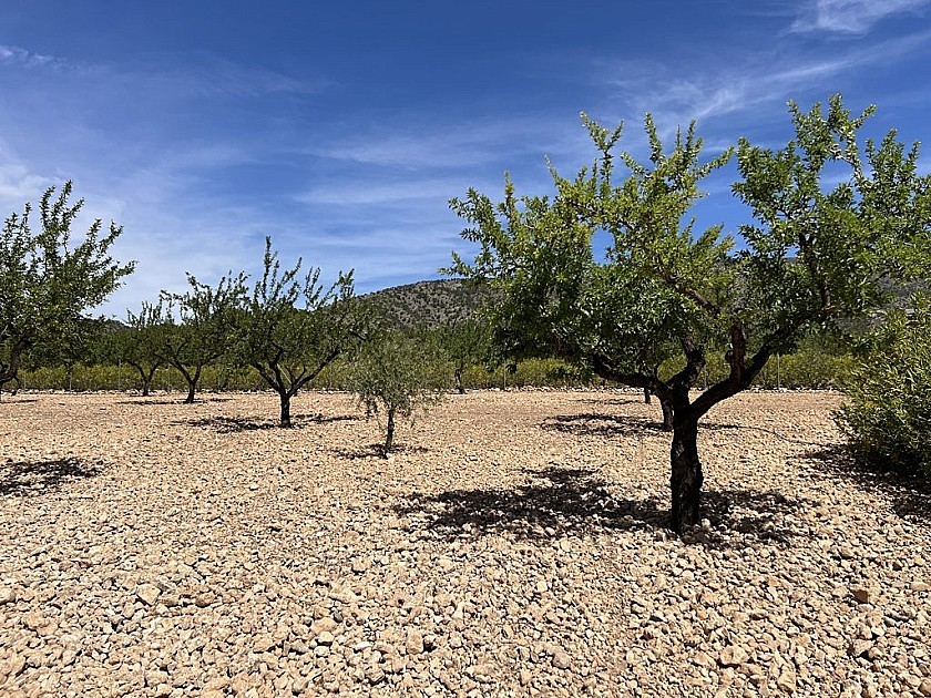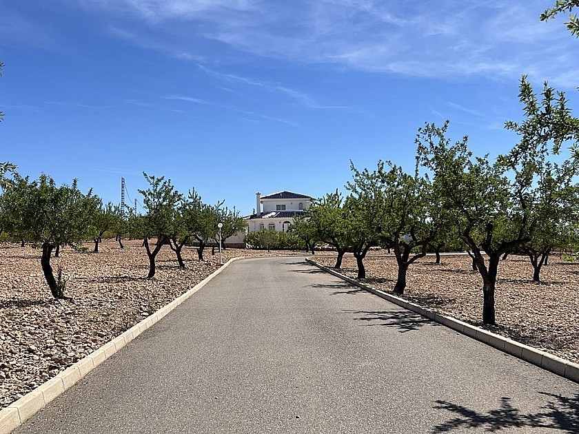 La parcela está completamente vallada y se accede por una puerta de entrada eléctrica con acceso para vehículos y acceso peatonal y con un camino asfaltado hasta llegar a la parcela. La parcela está cultivada con almendros y hay un camino asfaltado desde la entrada hasta el garaje y la casa. También hay un seto que rodea la zona de la piscina y la casa para dar privacidad.