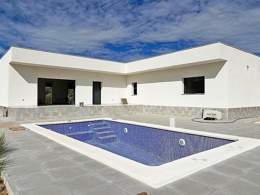 Esta nueva villa de estilo moderno está a punto de terminar. El chalet esta situado en Pinoso, a 5 minutos andando donde encontrara todos los servicios, tiene 160m² y consta de un amplio salon comedor y cocina amueblada (para 3.000) un lavadero, 3 dormitorios, 2 de ellos con armarios empotrados y 1 dormitorio con baño ensuite. La villa tiene pre-instalación de aire acondicionado en toda la casa (frío/calor), agua corriente y electricidad. La parcela tiene 10.000m², de los cuales 3.000m² están vallados. Hay una piscina de 8x4m con ducha exterior. El acceso a la propiedad es a través de un portón eléctrico y hay una selección de acabados y extras (cocina, baño, etc.). Si usted está buscando una nueva construcción, pero no quieren esperar meses, esta villa es para usted.