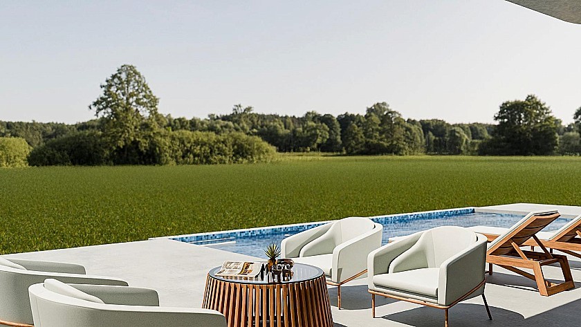 Todas las casas incluyen una terraza de hormigón impreso de 2 metros alrededor de la piscina (color y diseño a elegir), 1 metro alrededor de la casa, entrada con portón, vallado de 3.000 m², preinstalación de aire acondicionado por conductos, cocina estándar, puerta de seguridad, ventanas oscilobatientes alemanas (o correderas si se prefiere), chimenea con tiro incorporado, preinstalación de TV e internet, entrada con grava y varios metros alrededor de la vivienda, fosa séptica.