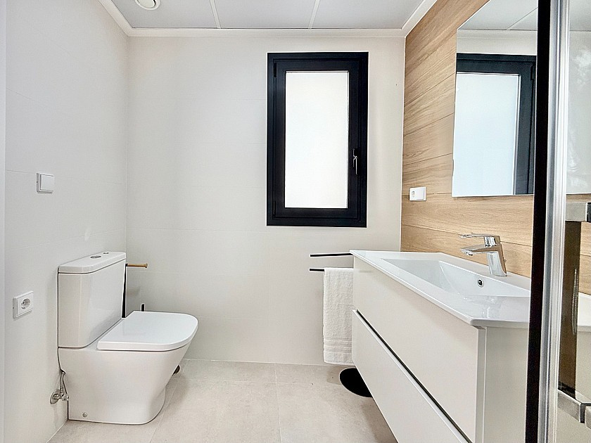 Sanitaires : douche à effet pluie, pare-soleil fixe, meuble de rangement et miroir éclairé.