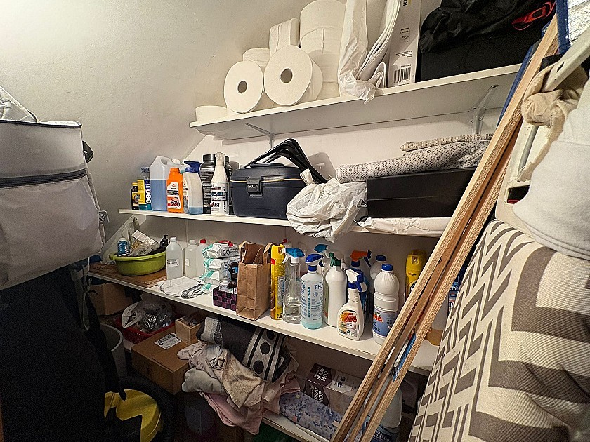 Le couloir avec buanderie dessert une salle d'eau avec WC, lavabo et meuble vasque, puis une jolie cuisine style cellier, avec étagères et rangements faits main, récemment installés en mai 2025. La grande cuisine traditionnelle, qui donne sur cette pièce, comprend également un coin repas et salon, un poêle à granulés, une cheminée et des poutres apparentes. Une porte donne sur un magnifique patio privé ensoleillé, idéal pour profiter pleinement de la vue.