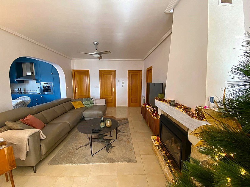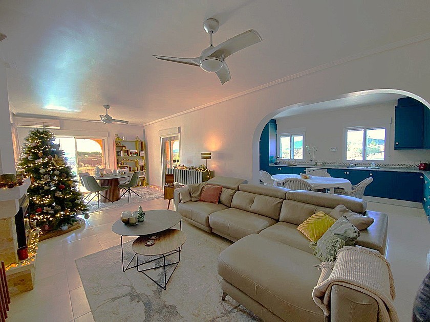 - Grand salon avec cheminée à gaz et cuisine ouverte.