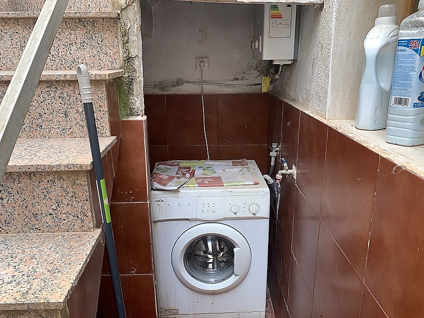 Plus loin, se trouve la salle de bain familiale avec douche, puis la porte arrière mène à une petite terrasse avec buanderie située sous l'escalier menant au premier étage, équipée du chauffage au gaz pour l'eau chaude et du lave-linge.