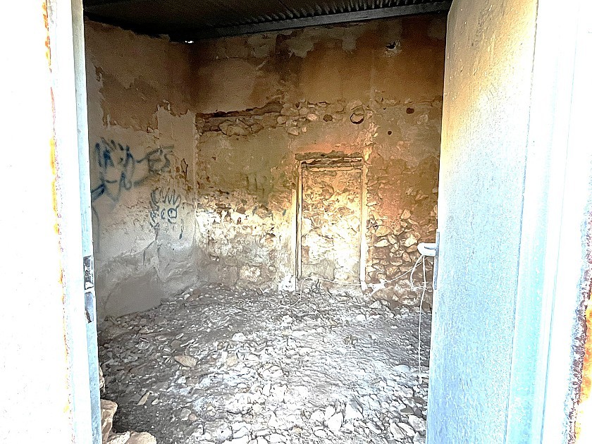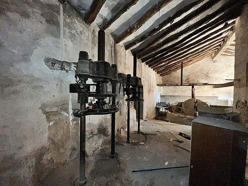 La pièce est divisée en deux autres pièces au fond, dont l'une abrite également d'anciens pressoirs à raisin en acier, fixés au mur du fond.