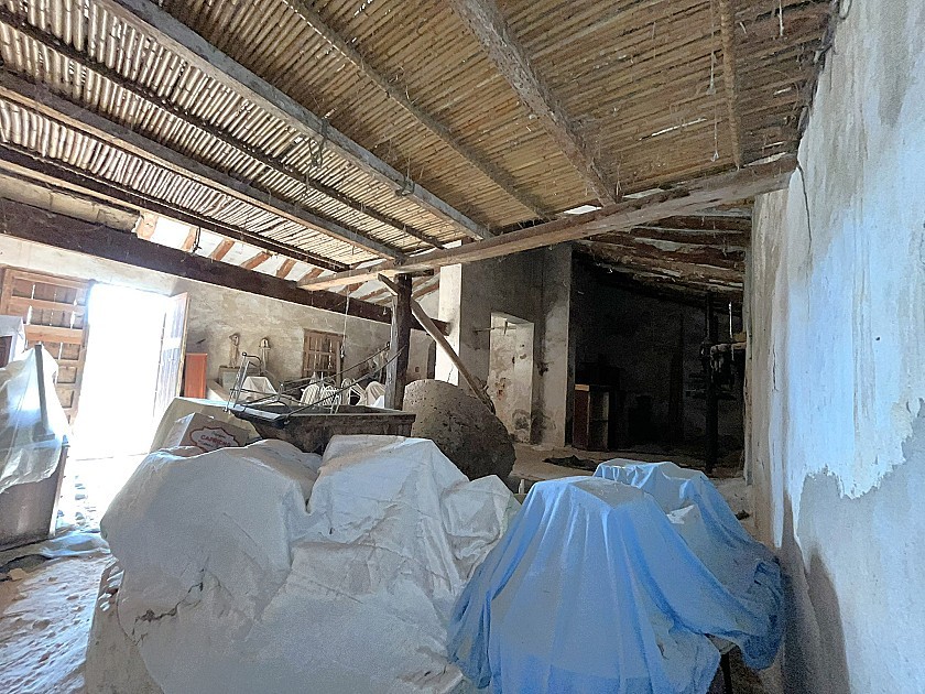 À l'intérieur, une très grande pièce s'ouvre sur une imposante porte d'entrée en bois massif. Au fond de cette pièce se trouve l'énorme pressoir à olives, avec sa table et son broyeur en pierre, toujours en état de marche et qui constitue un élément remarquable de cette propriété.
