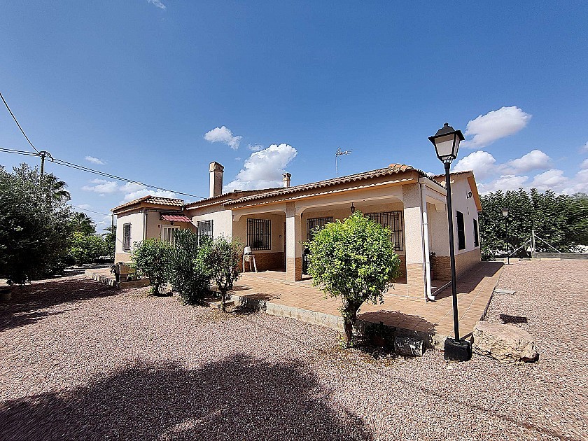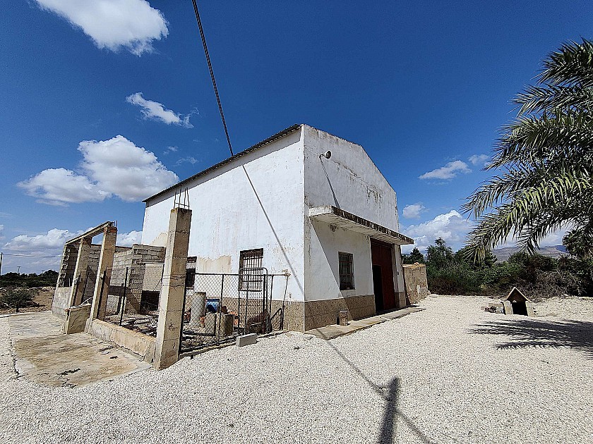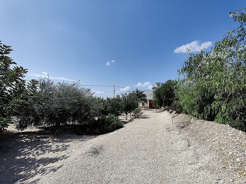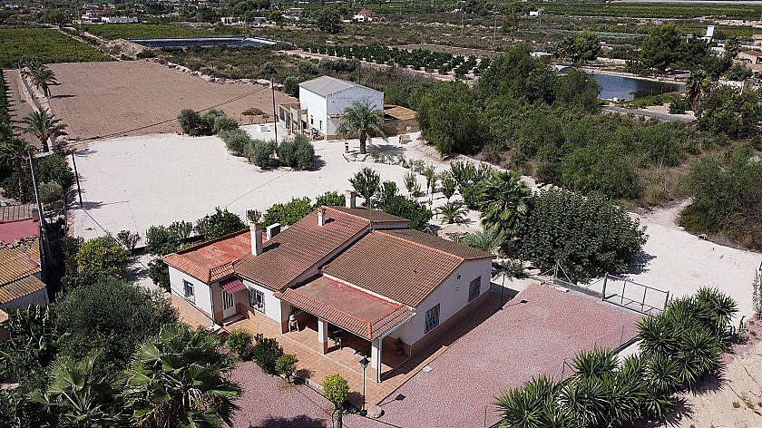 Vrijstaand landhuis nabij Crevillente, met een perceelgrootte van 10.000m2 en een mooie volgroeide tuin met fruitbomen, groenten en palmbomen. De woning heeft 3 slaapkamers, een woonkamer, open keuken, kantoor, open haard en een terras. Beneden is een grote open eetkamer/garage voor grote familie-evenementen, en een inloopkoelkast die wordt gebruikt voor de opslag van bloemen (het familiebedrijf). Er is een groot zwembad met overdekt terras, een buitenkeuken en eetkamer, met een kantoor en bijkeuken. Ook een klein voetbalveld en een ander gebouw dat wordt gebruikt voor opslag en dierenhok. Op het perceel bevindt zich ook een groot reservoir, dat gebruikt kan worden voor het bewateren van de planten. Er is elektriciteit en water. Gelegen op 5 minuten rijden van de steden Crevillente en Albatera.