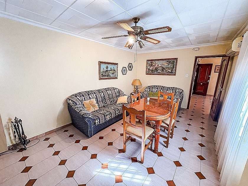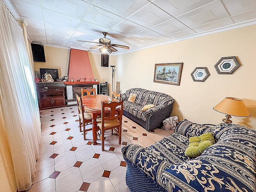 - Grote woon- en eetkamer, uitgerust met een open haard en een plafondventilator, voor een warme en gezellige sfeer.