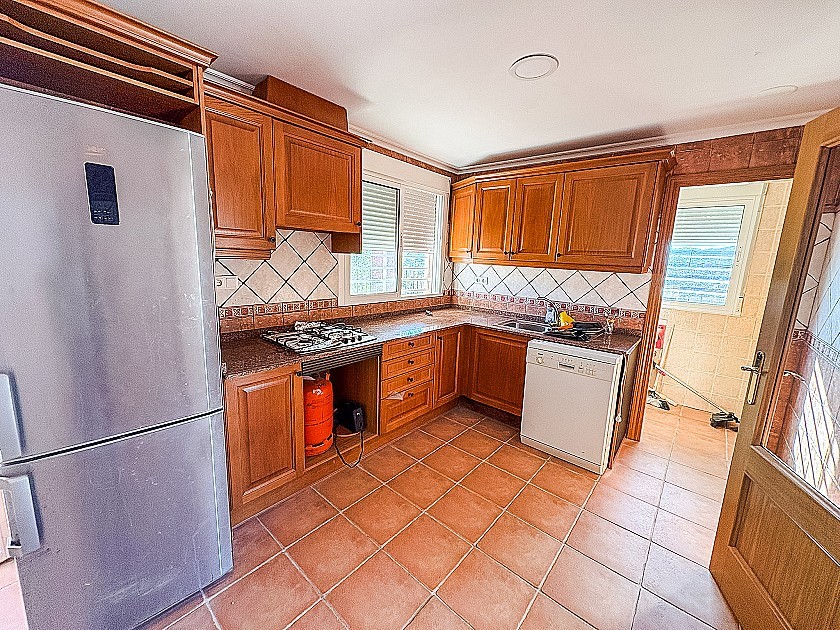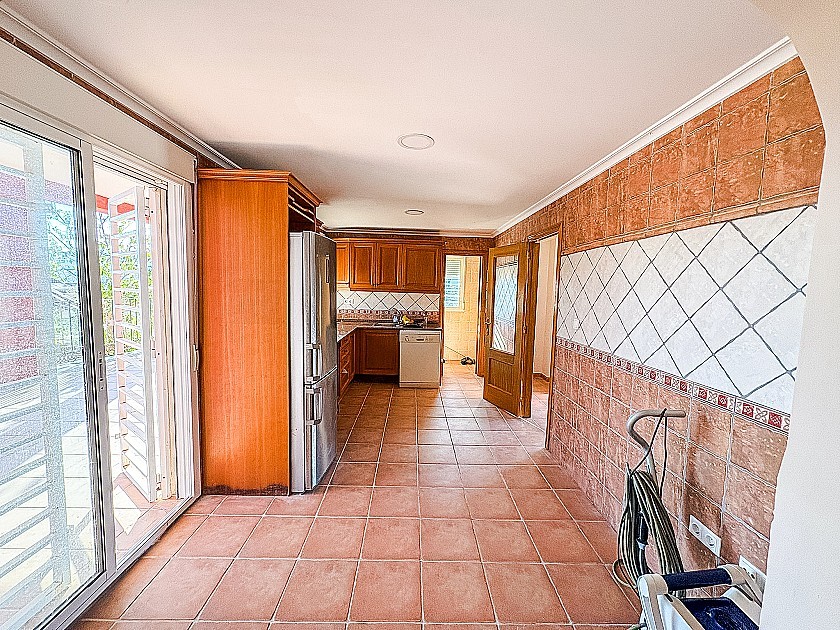 De hoofdingang leidt naar een gezellige veranda, die toegang geeft tot een ruime en lichte woon-/eetkamer met een houtkachel. Vanuit deze ruimte bereik je de volledig uitgeruste open keuken, met een praktische bijkeuken en directe toegang tot de veranda met uitzicht op het zwembad.