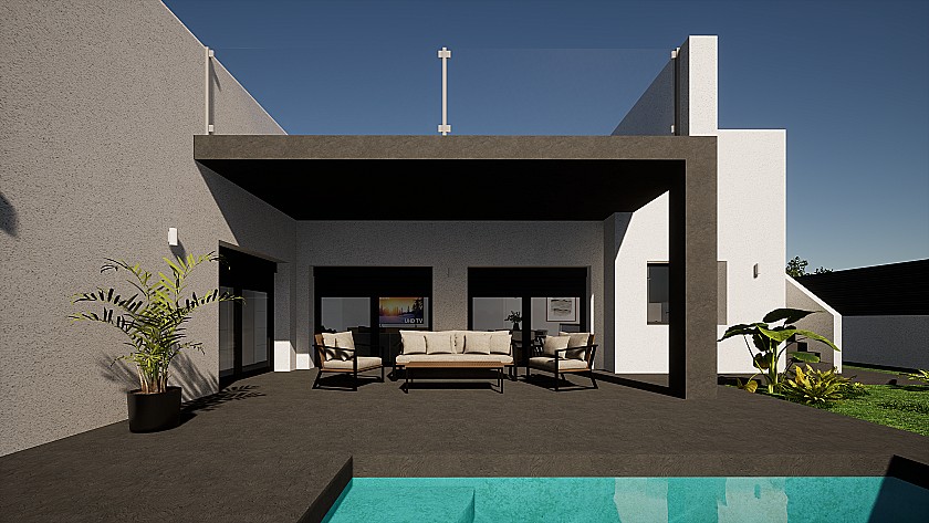 6.- Buitenruimtes Rondom het huis wordt een 80 cm brede bestrating aangelegd, afgewerkt met keramische bestrating. En er komt een betegeld gebied van ongeveer. Een gebied van ongeveer 1.000 m2 rond het huis wordt bedekt met wit grind op rustieke percelen. Muur met decoratief hekwerk met elektrisch gemotoriseerde schuifpoort aan de voorkant met voetgangerstoegang en kettingschakelhek naar de rest van de grenzen op stedelijke percelen. Op rustieke percelen komt er een kettingschakelhek van 3.000 m2. Hoofdtoegang tot het perceel met betonnen blokmuur van 1,80 m hoog en gemotoriseerde gelakte stalen schuifpoort.) Er komt een zwembad (grootte afhankelijk van het project), met een geplaveid terras rond het zwembad van ongeveer 50 m2, antislip keramische bestrating, met verschillende opties om uit te kiezen. De bekleding van het zwembad bestaat uit mozaïektegels (gresite) of keramische tegels met filtratiesysteem.