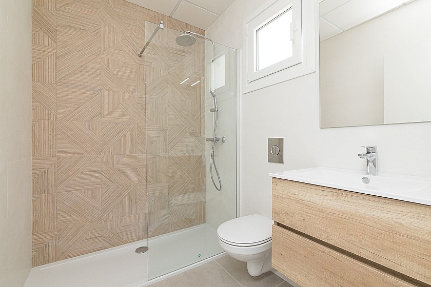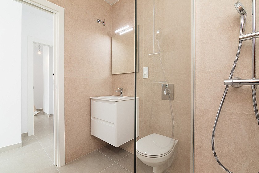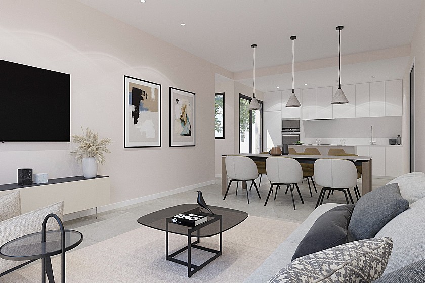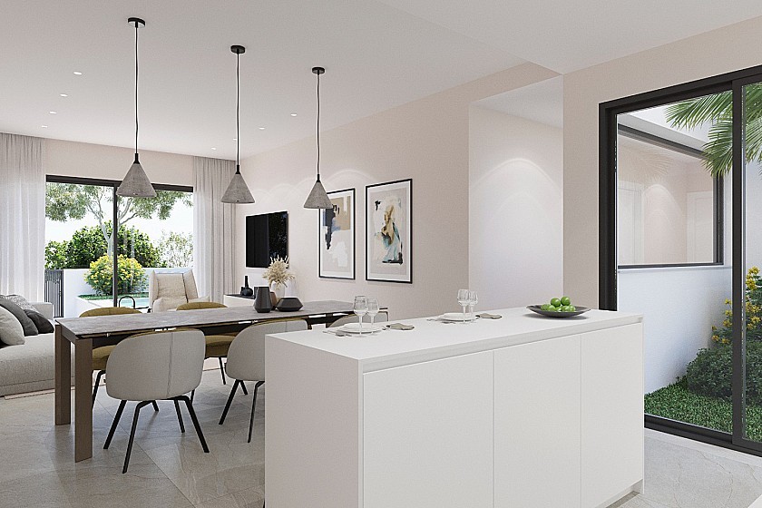 Binnen in de villa's willen we de woon-eetkamer met een keuken in kantoorstijl benadrukken, die ongeveer 37 m2 is. We kennen de behoeften van onze klanten en daarom hebben we een functioneel, dynamisch en elegant gebied ontworpen. De villa's hebben 3 tweepersoonsslaapkamers, waarvan twee met ingebouwde designkasten, de suite heeft een grote kleedkamer en badkamer.